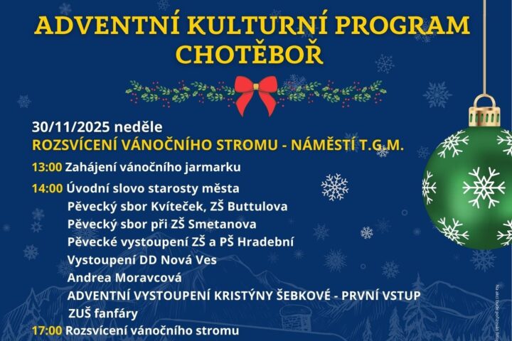 s velkým potěšením vás zveme na událost – ROZSVÍCENÍ VÁNOČNÍHO STROMU, které se uskuteční v neděli 3. prosince 2023 na Náměstí T. G. Masaryka v Chotěboři. Již od 15:00 hodin začne kulturní program, který je nejen symbolickým zahájením adventní doby, ale také příležitostí pro společné setkání a radostnou atmosféru.